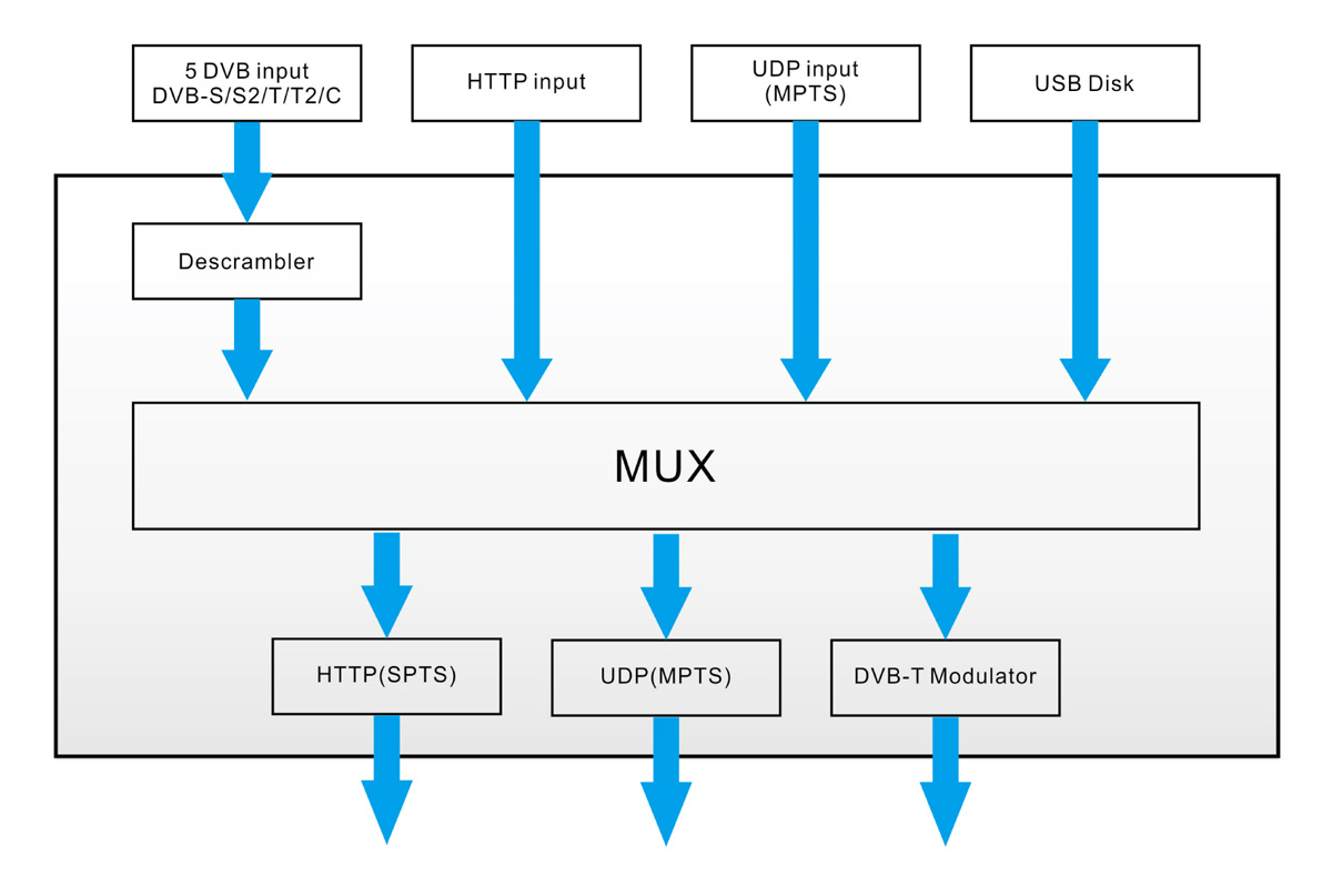 ● 5 group tuner input, support DVB-S/S2, DVB-T/T2, DVB-C and ISDB-T
